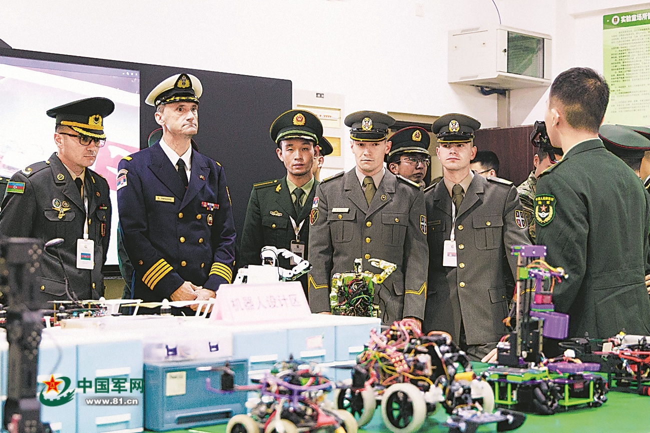 11月4日,第十二届陆军国际学员周组织中外学生参观陆军工程大学烽火机器人创新设计俱乐部。一场精彩的机器人赛场比赛吸引了众多同学驻足观看。